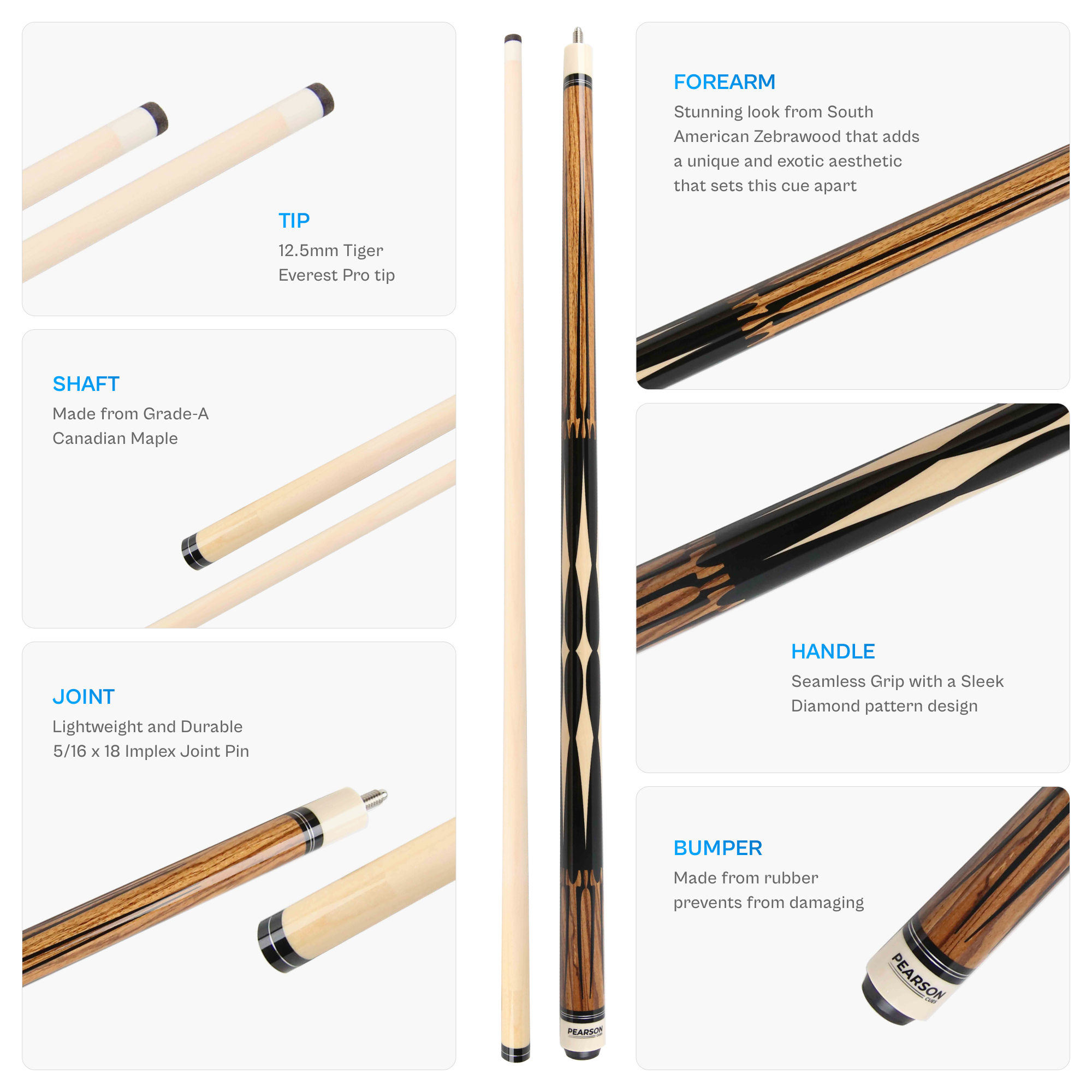 The forearm and butt sleeve feature stunning South American Zebrawood, adding a unique and exotic aesthetic that sets this cue apart. The intricate wood grain not only enhances the visual appeal but also signifies the high craftsmanship and quality that go into our Pearson Players Cue 3. The Shaft is expertly crafted from Grade-A Canadian maple wood and fitted with a Tiger Everest Pro tip, this 2-piece cue delivers exceptionally smooth and precise strokes. Available in a range of weights from a lightweight 18oz to a solid 21oz, it caters to players of all preferences and styles