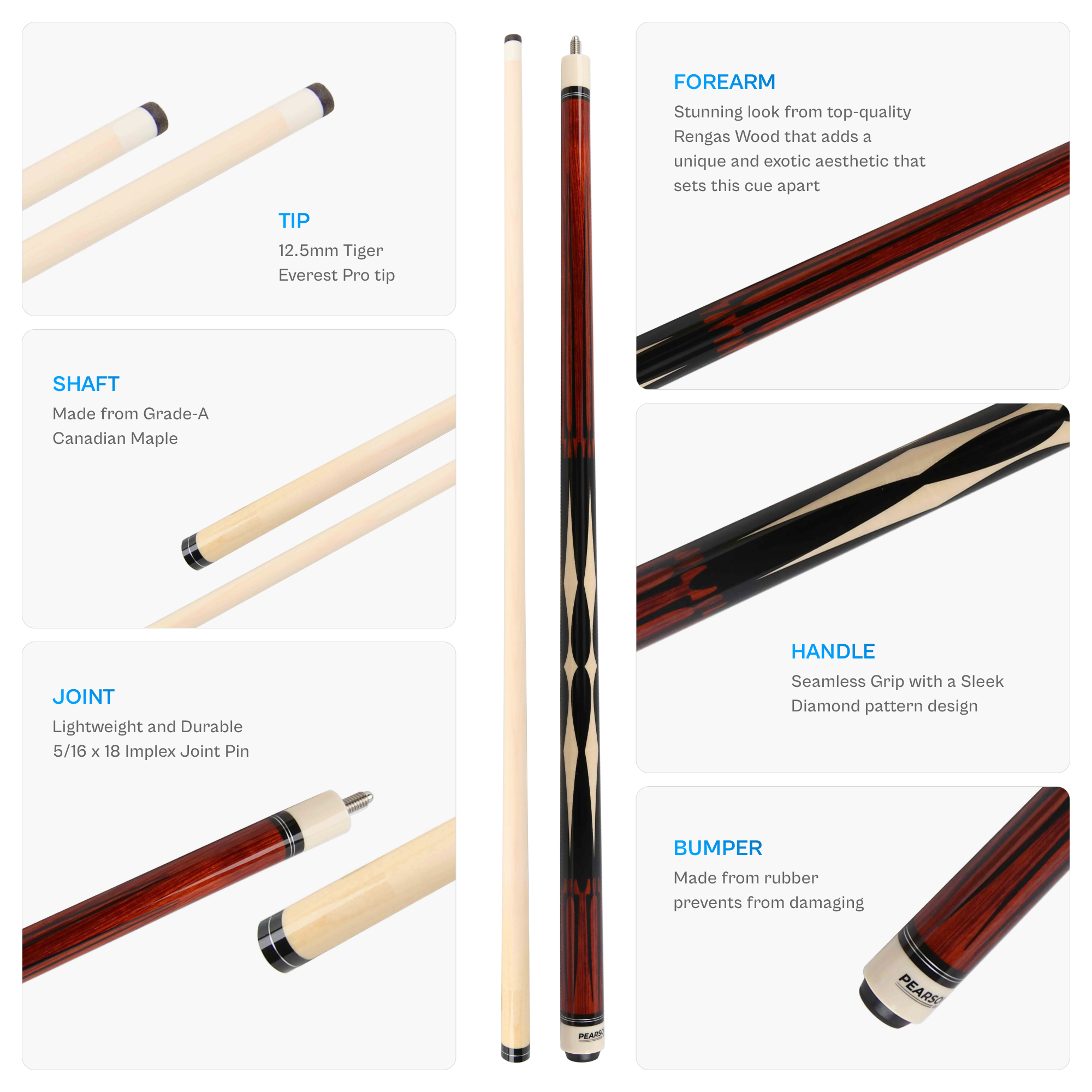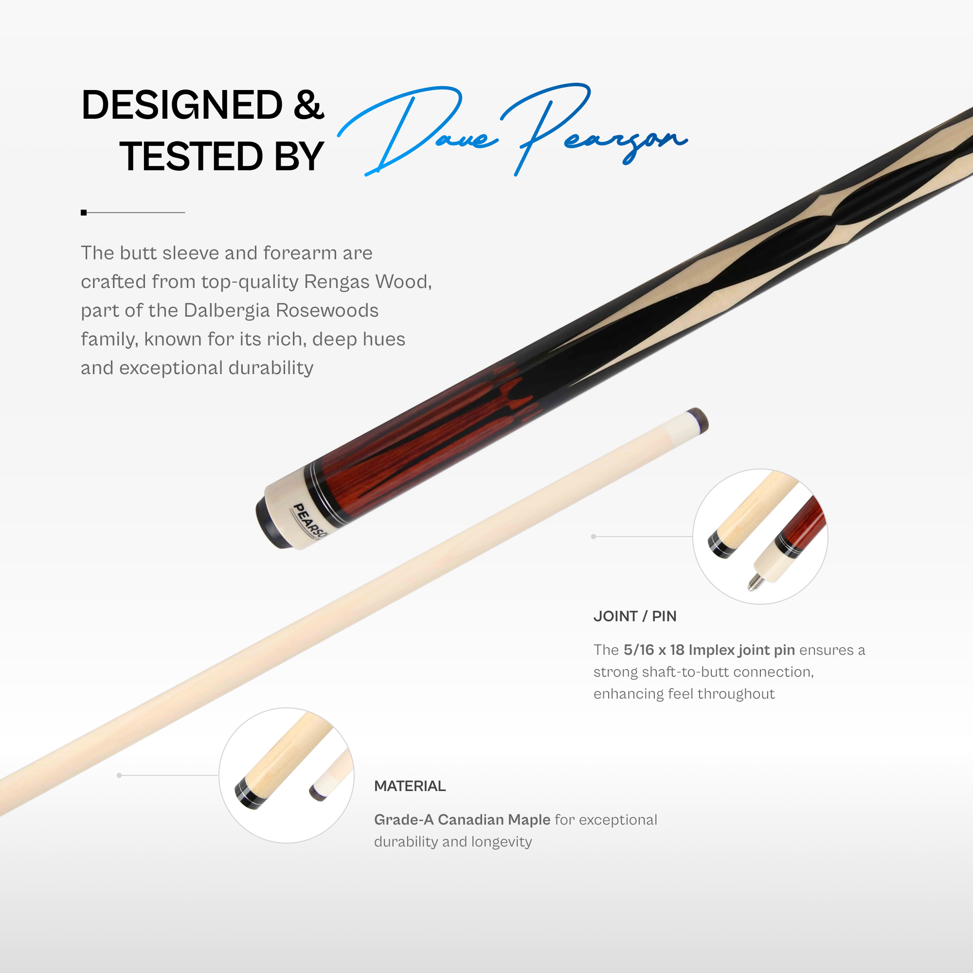 This Players Series 4 pool cue by Pearson Cues offers both high-end quality and style. The handle consists of top-quality Rengas Wood from the Dalbergia Rosewoods on the butt sleeve and forearm. The Players Series 4 pool cue also features a timeless black-and-white design.