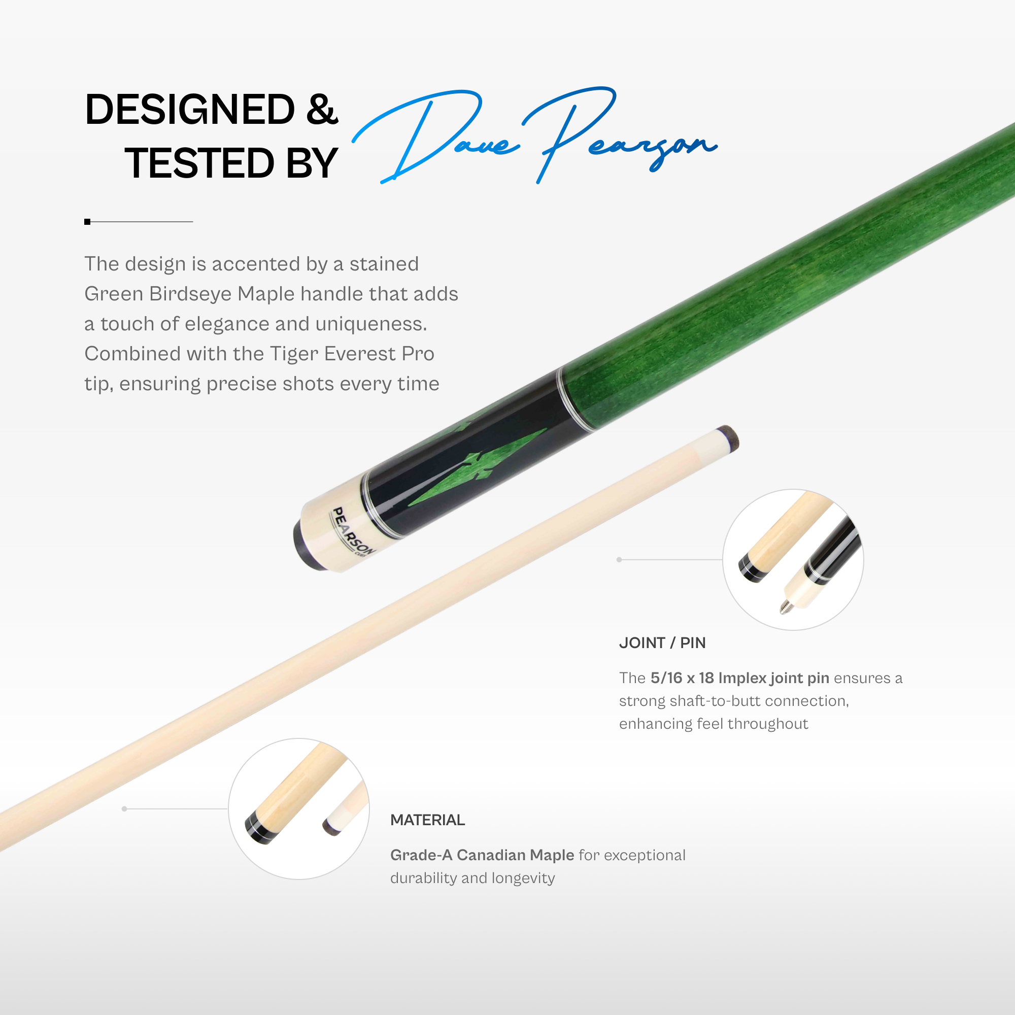 The design features a sleek black forearm and butt sleeve, accented by a stained Green Birdseye Maple handle that adds a touch of elegance and uniqueness. This stylish combination not only enhances the cue’s visual appeal but also offers a personalized flair, making it a standout choice for any pool player. Handcrafted from Grade-A Canadian maple wood and fitted with a Tiger Everest Pro tip, this 2-piece cue ensures smooth, precise shots every time. With weight options ranging from a light 18oz to a solid 21oz, it caters to players of all preferences.