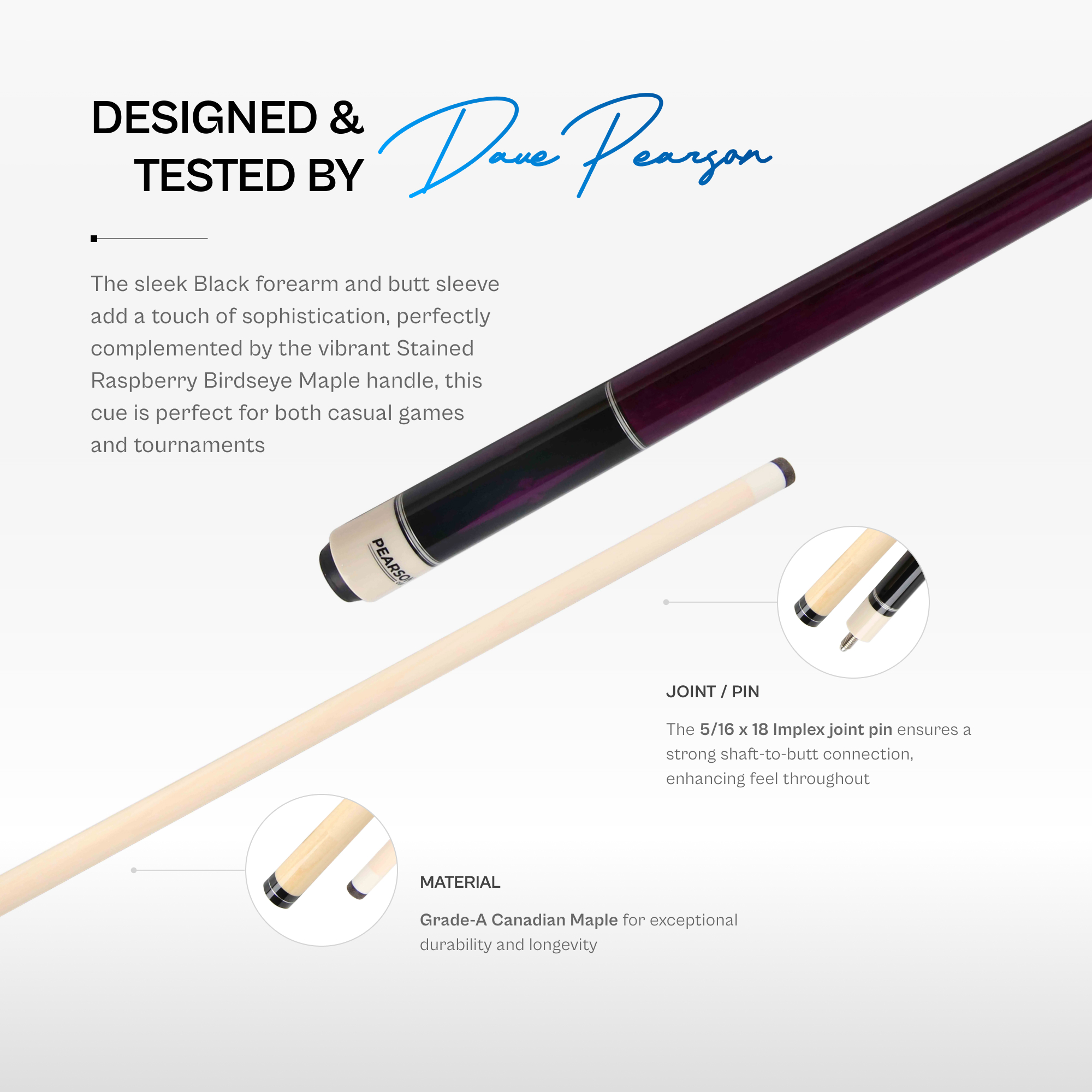The sleek Black forearm and butt sleeve add a touch of sophistication, perfectly complemented by the vibrant Stained Raspberry Birdseye Maple handle. This striking combination not only enhances the cue’s aesthetic appeal but also provides a comfortable and secure grip. Constructed from high-quality Grade-A Canadian maple wood and featuring a Tiger Everest Pro tip, this 2-piece cue promises consistently smooth and precise shots. Available in weights ranging from a light 18oz to a hefty 21oz, it caters to players of all preferences.