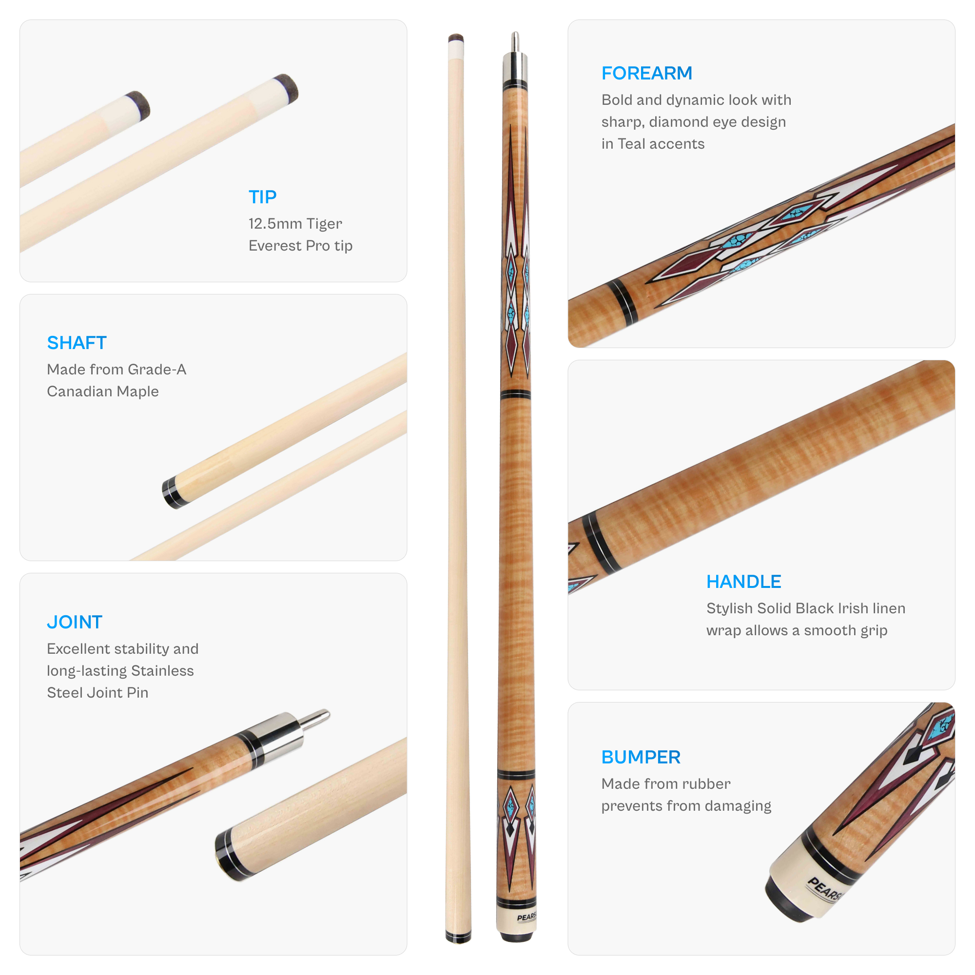 This Pearson Prestige Cue has been carefully designed to look, feel, and play like a professional. This Pearson Prestige 8 cue has a Birdseye Maple handle with a Teal accents design. It has no peer at this price. Be the first to get the Pearson Prestige advantage.